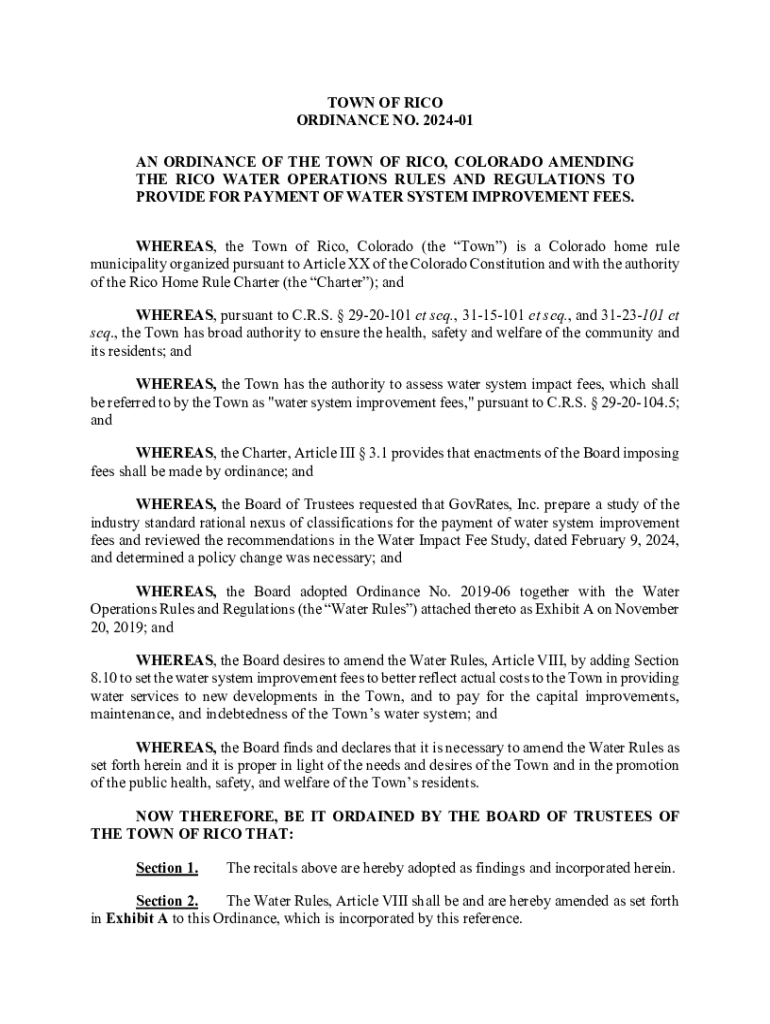 TOWN OF RICO ORDINANCE NO. 202401 AN ORDINANCE OF THE TOWN OF RICO, COLORADO AMENDING THE RICO WATER OPERATIONS RULES AND REGULATIONS TO PROVIDE FOR PAYMENT OF WATER SYSTEM IMPROVEMENT FEES. WHEREAS,