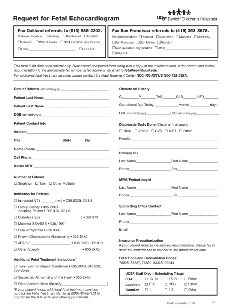 trittRequest for Fetal EchocardiogramlJCs: Benioff Children\'s HospitalsFax Oakland referrals to (510) 9852202.Fax San Francisco referrals to (415) 3538675.Preferred location: BerkeleyPreferred location: