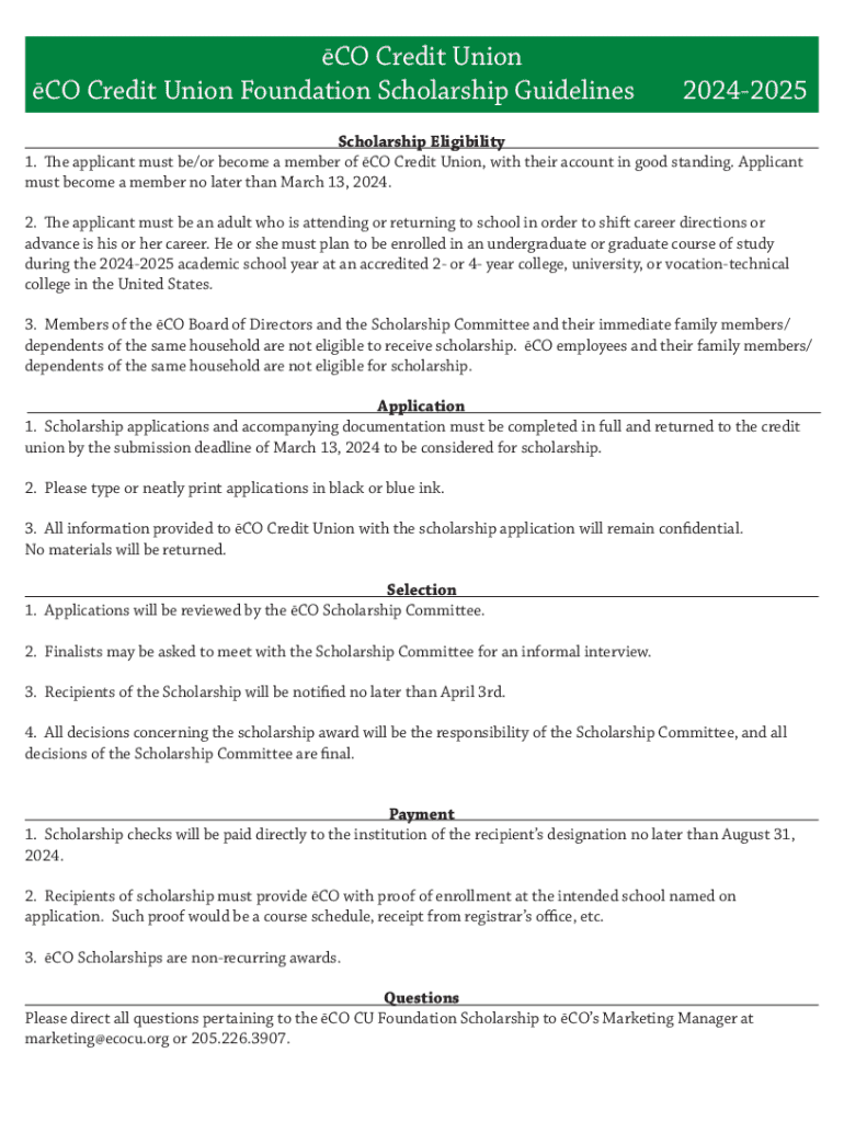 This document outlines the eligibility criteria, application process, selection procedures, payment details, and additional information related to the ēCO Credit Union Foundation Scholarship for the academic year 2024-2025. It is intended for applicants who are members of ēCO Credit Union and are seeking to further their education at accredited institutions.