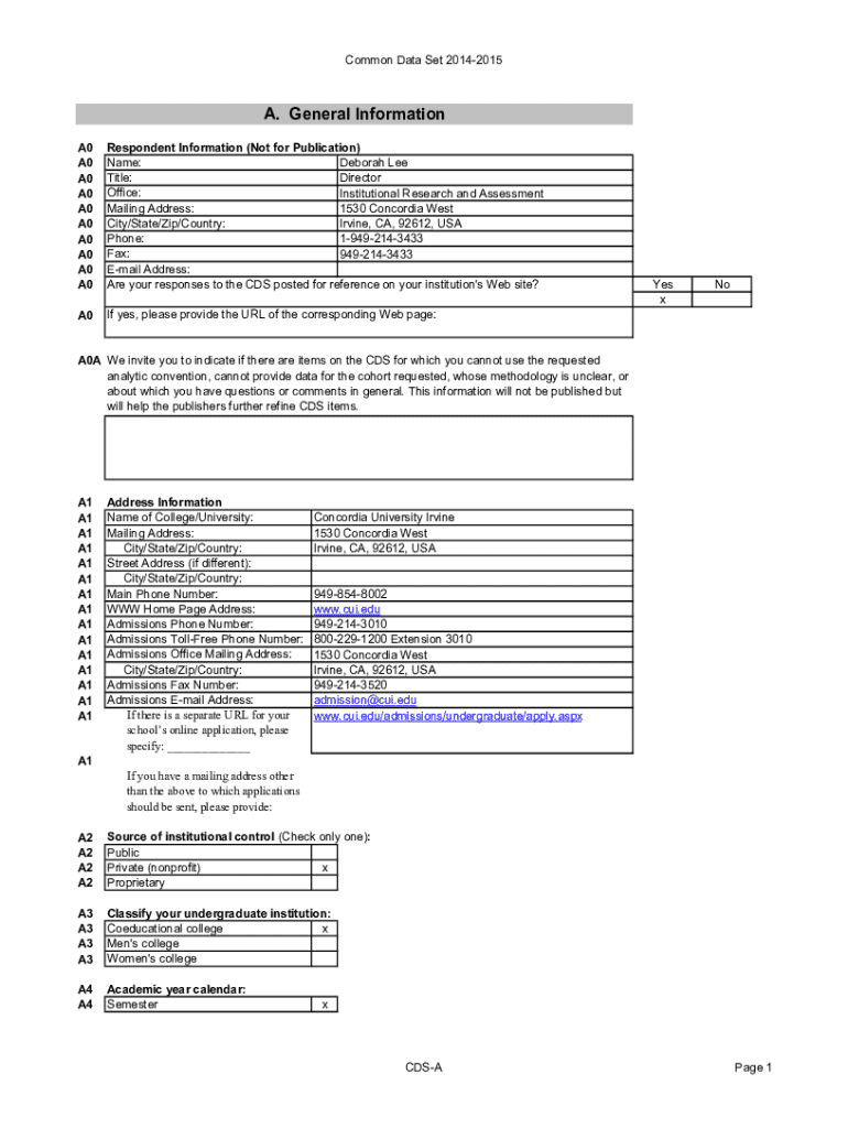 Common Data Set 20142015A. General Information A0 A0 A0 A0 A0 A0 A0 A0 A0 A0Respondent Information (Not for Publication) Name: Deborah Lee Title: Director Office: Institutional Research and Assessment