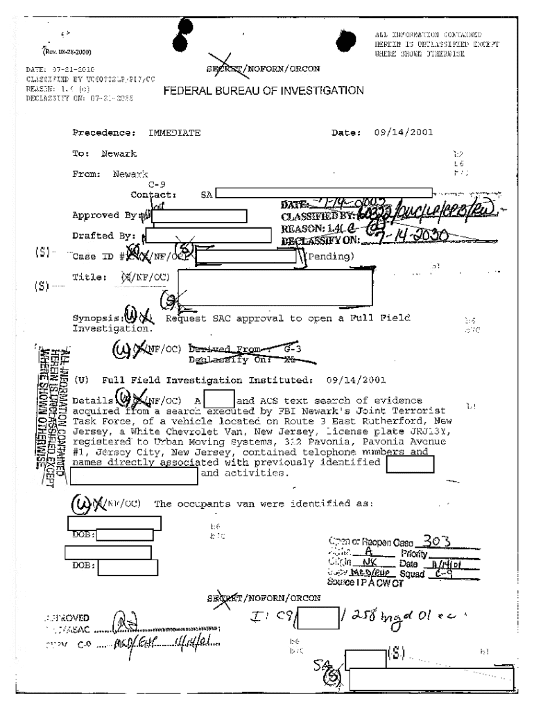 This document contains investigative details about five Israeli nationals detained in conjunction with the investigation of the September 11 attacks. It includes evidence obtained from a vehicle associated with Urban Moving Systems, eyewitness accounts, and subsequent interviews that raise questions about the activities of these individuals immediately before and after the attacks.