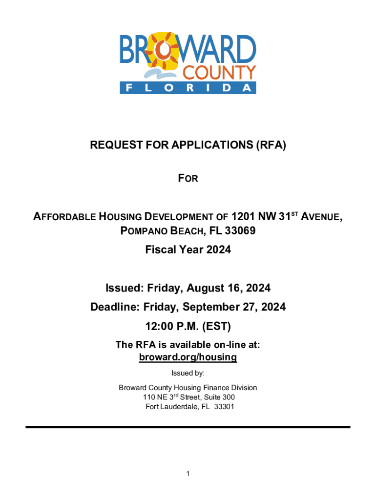 REQUEST FOR APPLICATIONS (RFA) FOR AFFORDABLE HOUSING DEVELOPMENT OF 1201 NW 31ST AVENUE, POMPANO BEACH, FL 33069 Fiscal Year 2024 Issued: Friday, August 16, 2024 Deadline: Friday, September 27, 2024