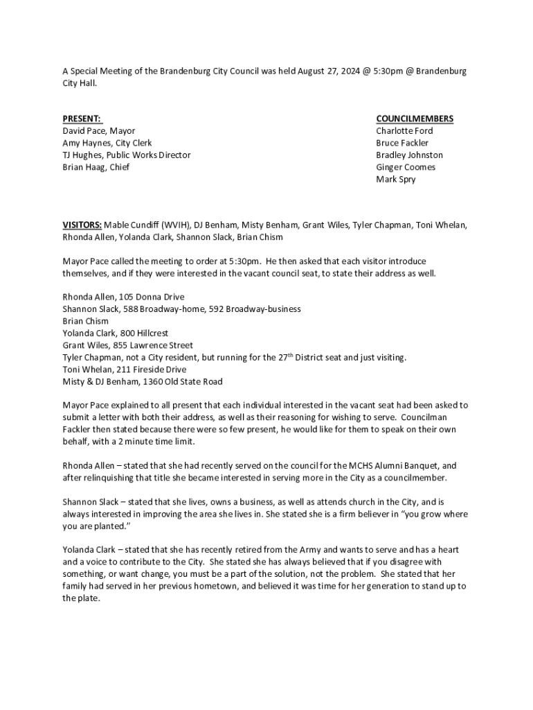 A Special Meeting of the Brandenburg City Council was held August 27, 2024 @ 5:30pm @ Brandenburg City Hall.PRESENT: David Pace, Mayor Amy Haynes, City Clerk TJ Hughes, Public Works Director Brian