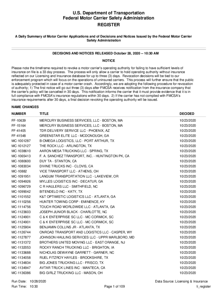 U.S. Department of Transportation Federal Motor Carrier Safety Administration REGISTER A Daily Summary of Motor Carrier Applications and of Decisions and Notices Issued by the Federal Motor Carrier