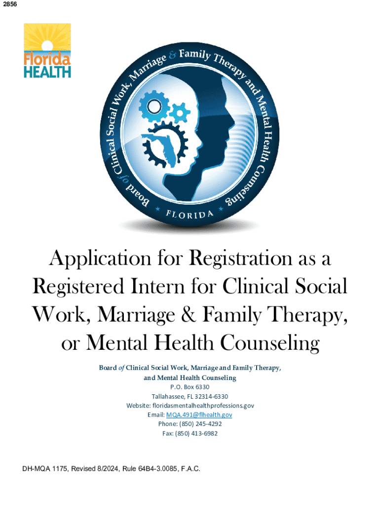 This document serves as an application form for individuals seeking registration as a Registered Intern in the fields of Clinical Social Work, Marriage & Family Therapy, or Mental Health Counseling in Florida. The application requires personal information, fee payment, verification of prior licenses, and details relating to educational qualifications and supervised field placements.
