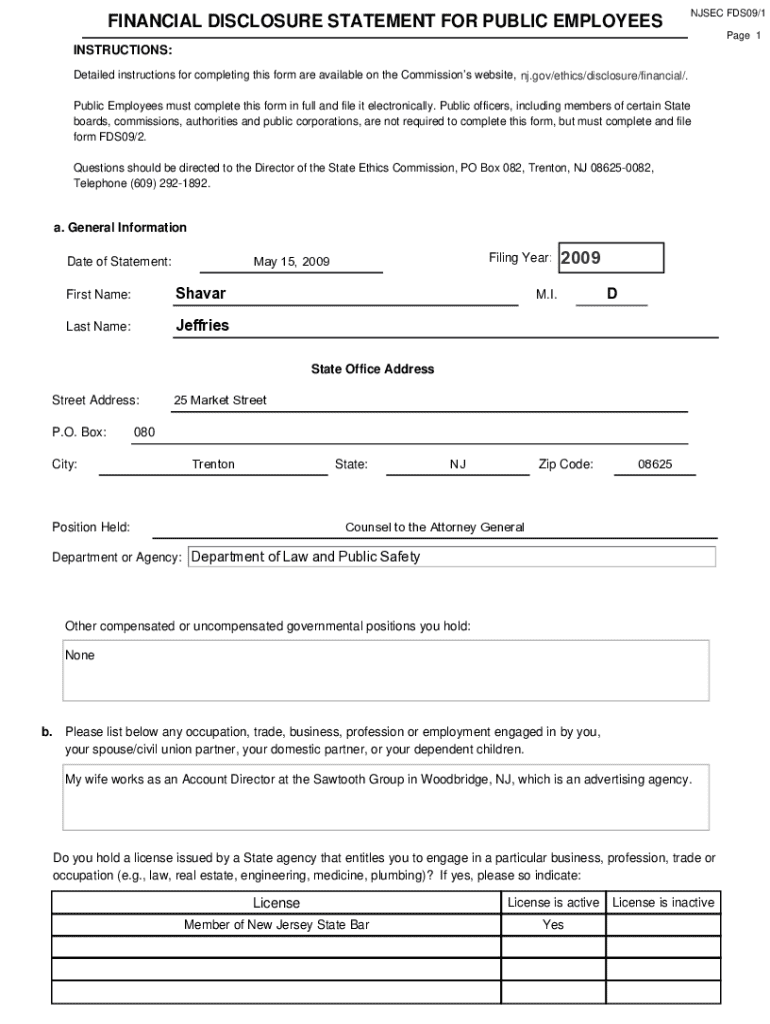 This financial disclosure statement must be completed by public employees including detailed information about their assets, income, liabilities, and any financial or business relationships that could pose a conflict of interest or ethical concern. It includes comprehensive sections on personal information, employment details, assets, income sources, and liabilities, with specific instructions for completion and electronic submission.