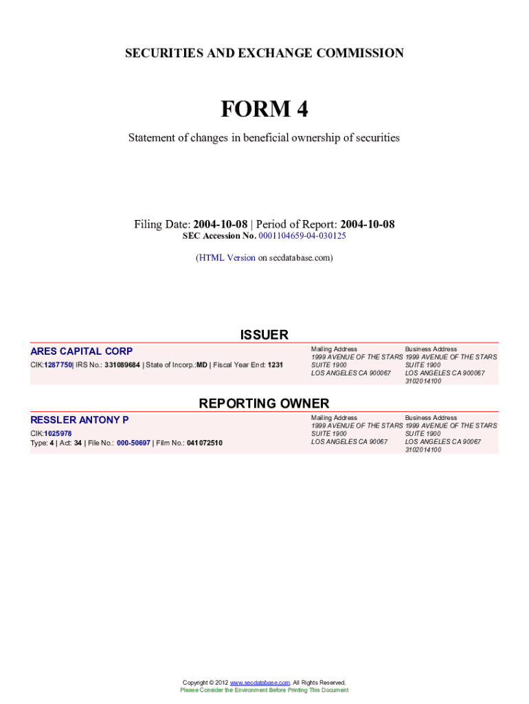 This document is a Form 4 filing with the SEC that reports changes in beneficial ownership of securities by a reporting person, specifically Antony P. Ressler, related to Ares Capital Corp. The form details transactions involving common stock, including acquisition information.
