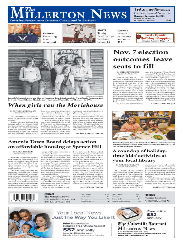 This edition of The Millerton News covers various topics including local sports, election outcomes, affordable housing developments, community events, and a range of cultural activities in the Northeastern Dutchess County area. Features include a roundup of holiday activities at local libraries, coverage of community concerts, and insights into local history with a focus on the iconic Millerton Moviehouse. The paper highlights the community\'s engagement with local issues and events,...
