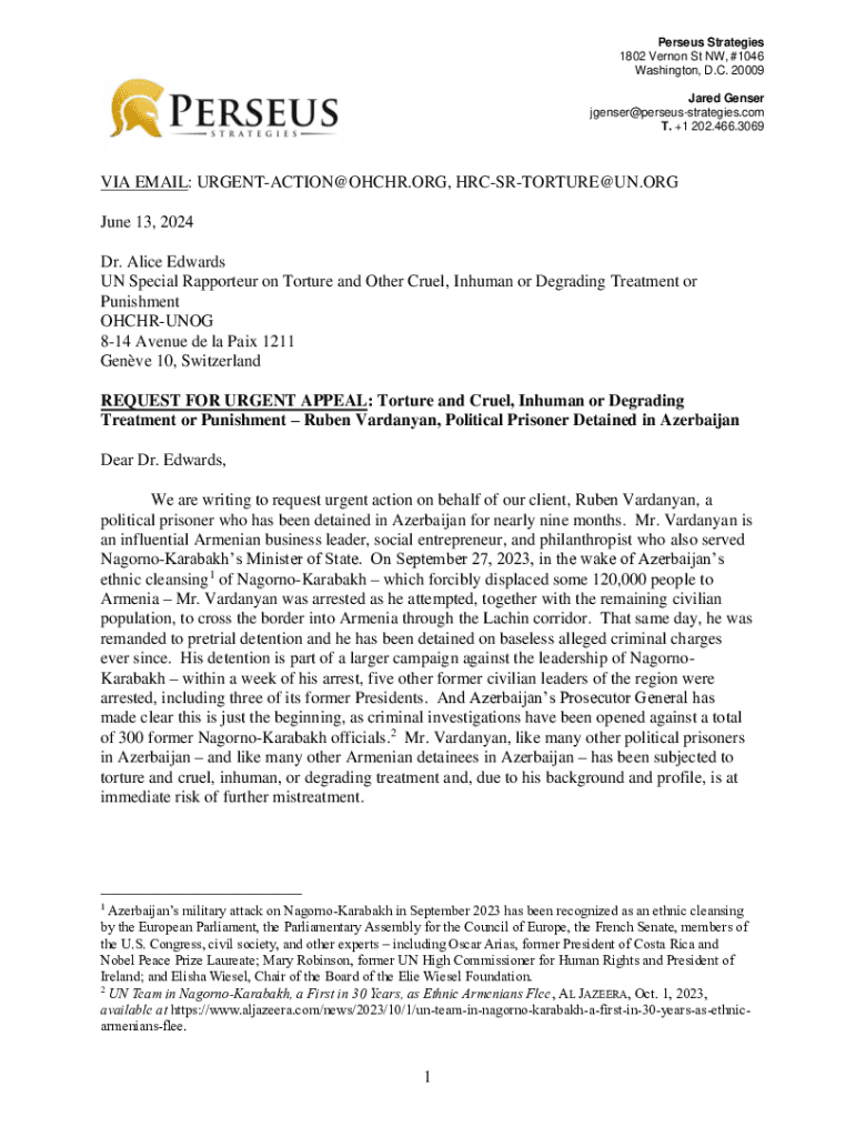 Perseus Strategies 1802 Vernon St NW, #1046 Washington, D.C. 20009 Jared Genser jgenser@perseusstrategies.com T. +1 202.466.3069VIA EMAIL: URGENTACTION@OHCHR.ORG, HRCSRTORTURE@UN.ORG June 13, 2024