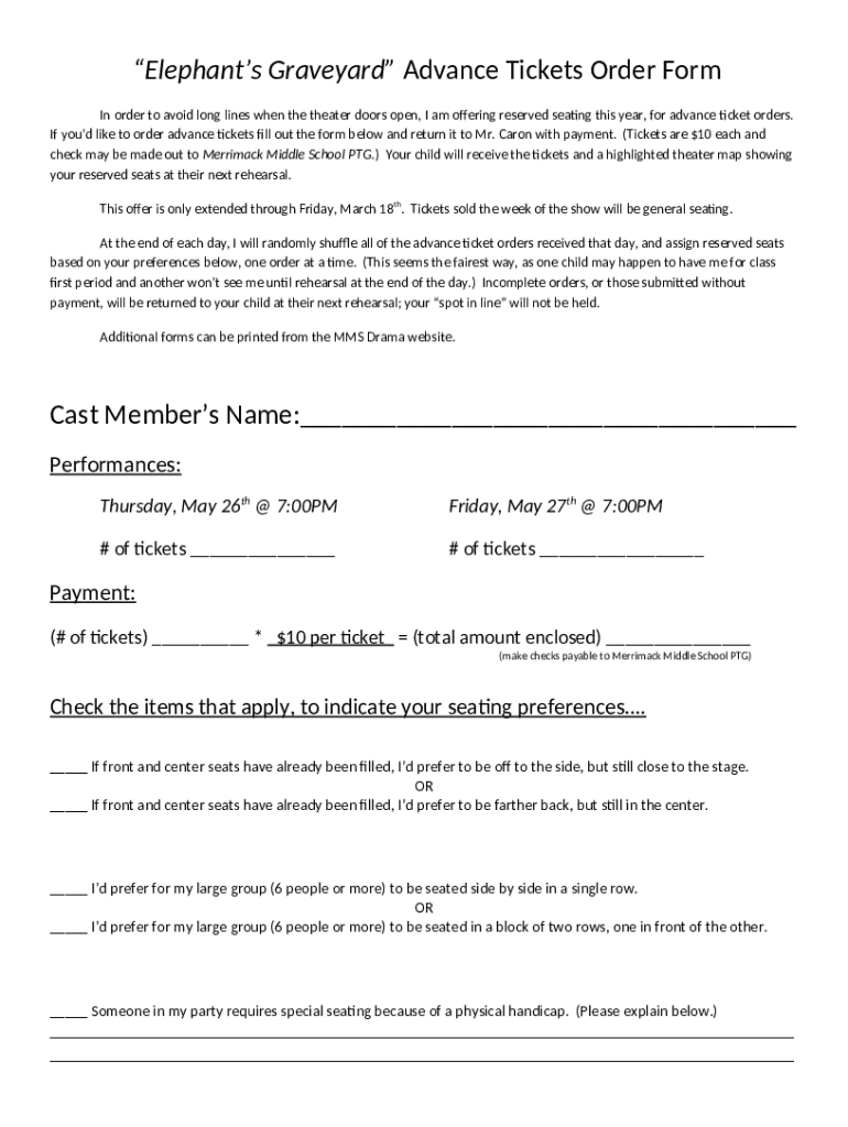 Instructions for the form Elephant's Graveyard Advance Tickets Order