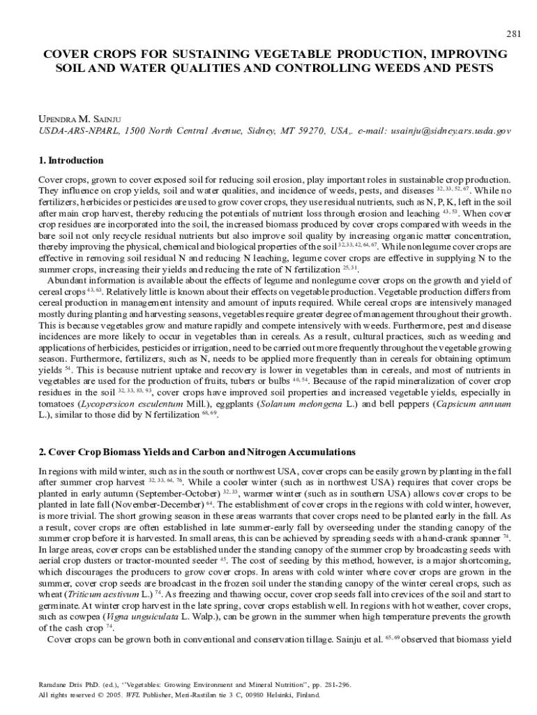 281COVER CROPS FOR SUSTAINING VEGETABLE PRODUCTION, IMPROVING SOIL AND WATER QUALITIES AND CONTROLLING WEEDS AND PESTSUPENDRA M. SAINJU USDAARSNPARL, 1500 North Central Avenue, Sidney, MT 59270, USA,.