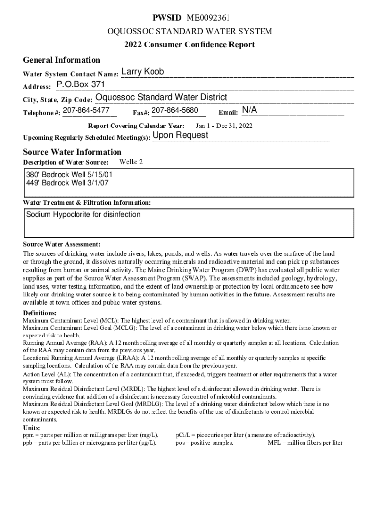 PWSID ME0092361 OQUOSSOC STANDARD WATER SYSTEM 2022 Consumer Confidence Report General InformationLarry Koob Water System Contact Name: ___ P.O.Box 371 Address: ___Oquossoc Standard Water District