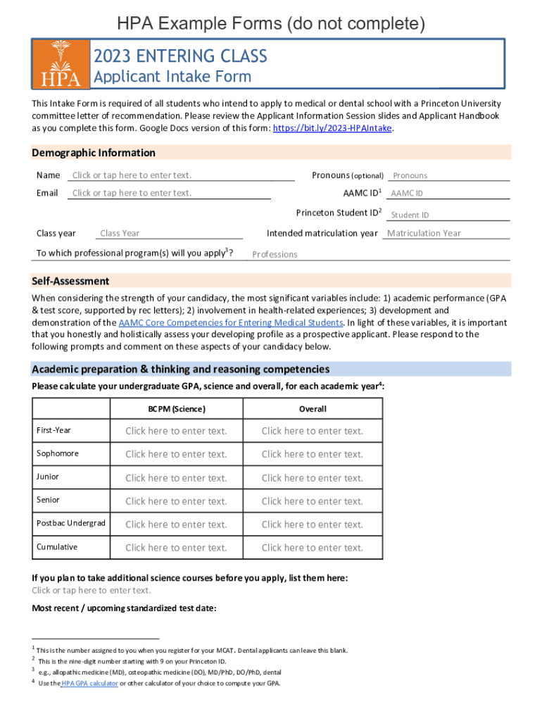 HPA Example Forms (do not complete) 2023 ENTERING CLASS Applicant Intake FormThis Intake Form is required of all students who intend to apply to medical or dental school with a Princeton University