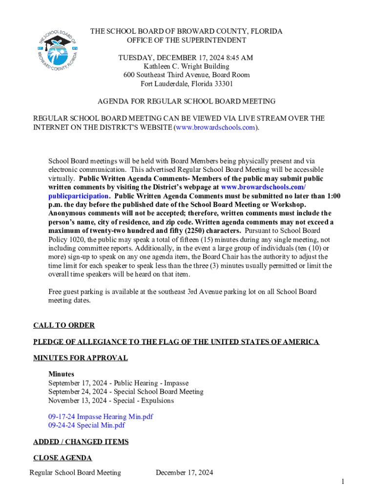 This document outlines the agenda for the Regular School Board Meeting of The School Board of Broward County, Florida, scheduled for December 17, 2024. It provides details on committee reports, consent agenda items, public participation, and various administrative matters.