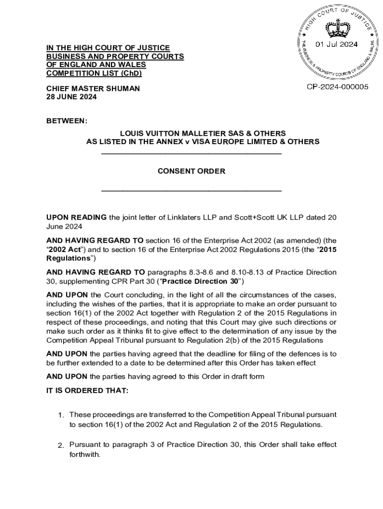 IN THE HIGH COURT OF JUSTICE BUSINESS AND PROPERTY COURTS OF ENGLAND AND WALES COMPETITION LIST (ChD) CHIEF MASTER SHUMAN 28 JUNE 2024 BETWEEN: LOUIS VUITTON MALLETIER SAS & OTHERS AS LISTED IN THE