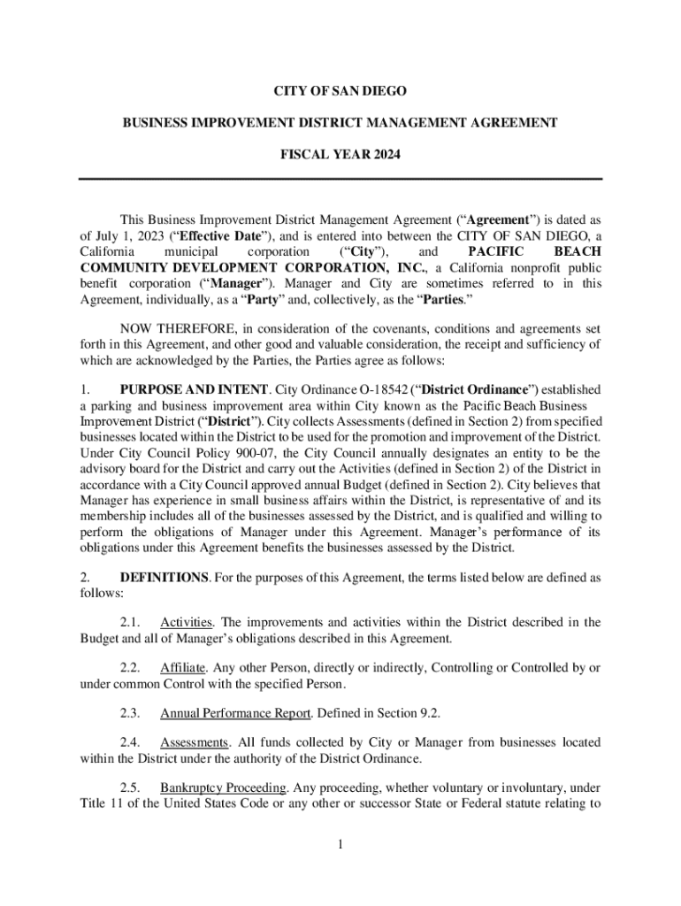 CITY OF SAN DIEGO BUSINESS IMPROVEMENT DISTRICT MANAGEMENT AGREEMENT FISCAL YEAR 2024This Business Improvement District Management Agreement (Agreement) is dated as of July 1, 2023 (Effective Date),