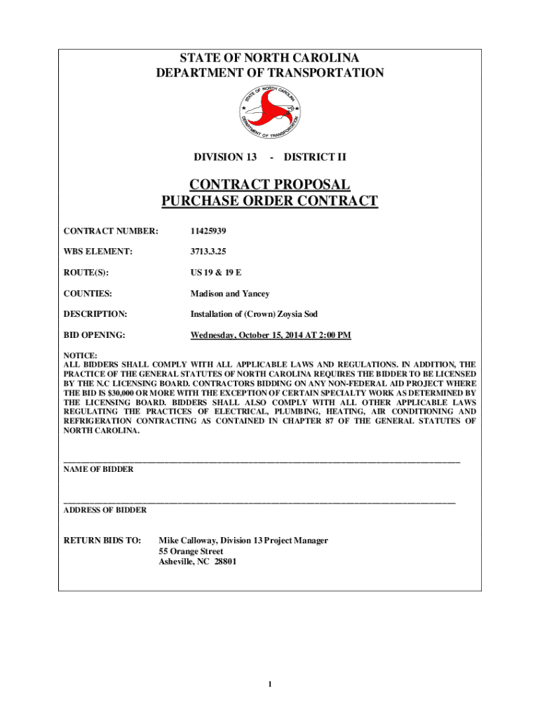 STATE OF NORTH CAROLINA DEPARTMENT OF TRANSPORTATIONDIVISION 13 DISTRICT IICONTRACT PROPOSAL PURCHASE ORDER CONTRACT CONTRACT NUMBER:11425939WBS ELEMENT:3713.3.25ROUTE(S):US 19 & 19 ECOUNTIES:Madison