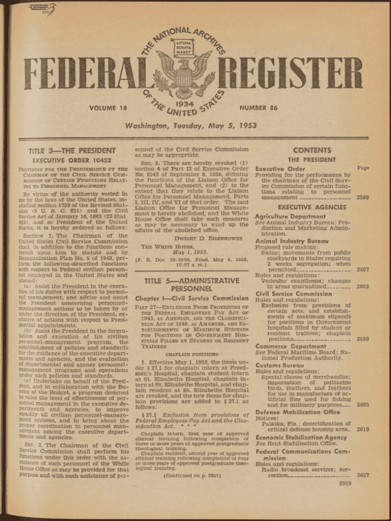 . &S.FEDERAL VOLUME 18^REGISTER 1934 * Wa n t e d *^NUMBER 86Washington, Tuesday, May 5, 1953TITLE 3 THE PRESIDENT EXECUTIVE ORDER 10452 Providing for the P erformance by th e Chairman o f t h C iv