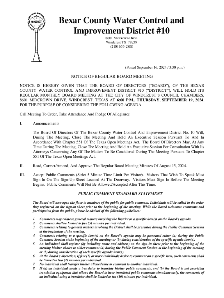 This document provides notice of the regular monthly board meeting for the Bexar County Water Control and Improvement District #10, including the agenda, public comment procedures, and resolutions for discussion and action regarding various water utility projects and financial matters.