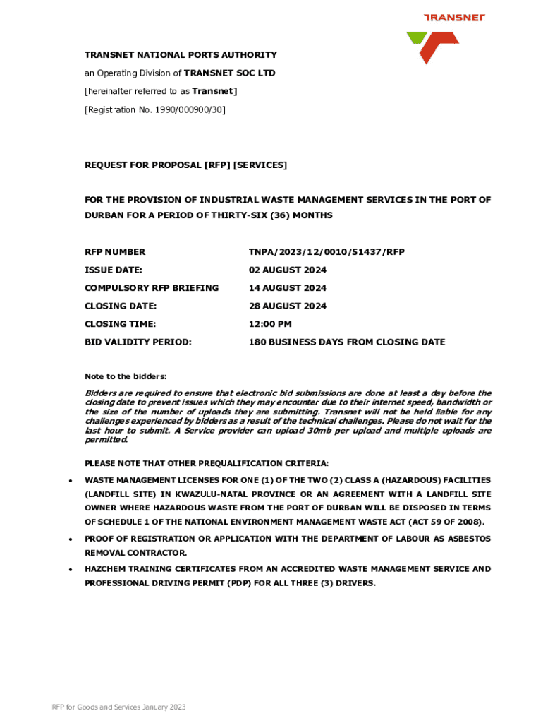 This Request for Proposal (RFP) is issued by the Transnet National Ports Authority for the provision of industrial waste management services in the Port of Durban for a duration of 36 months. The document outlines the requirements, terms, and conditions for bidders interested in providing waste management services, including necessary qualifications, submission guidelines, and evaluation criteria.