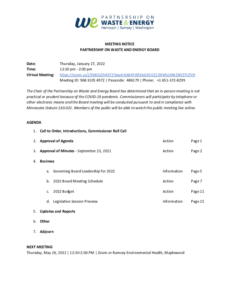 This document serves as a notice for the Partnership on Waste and Energy Board meeting scheduled for January 27, 2022. Due to the COVID-19 pandemic, the meeting will be conducted virtually, allowing public participation through online means. The agenda covers various topics including approval of prior minutes, legislative platform review, budget approval, and updates on ongoing projects.