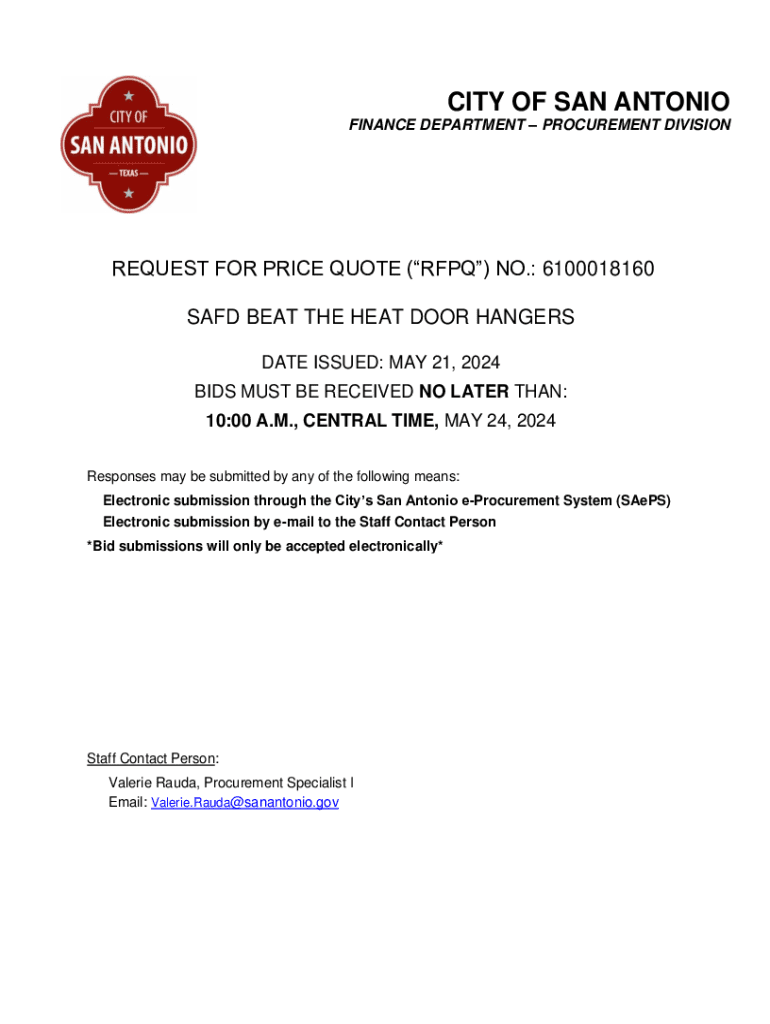 This document outlines the request for price quotes issued by the City of San Antonio\'s Finance Department for the printing of Beat the Heat Door Hangers. It includes instructions for bidders, submission requirements, specifications for the project, and the terms and conditions governing the contract. The aim is to solicit bids to inform the public about safety practices during summer weather.