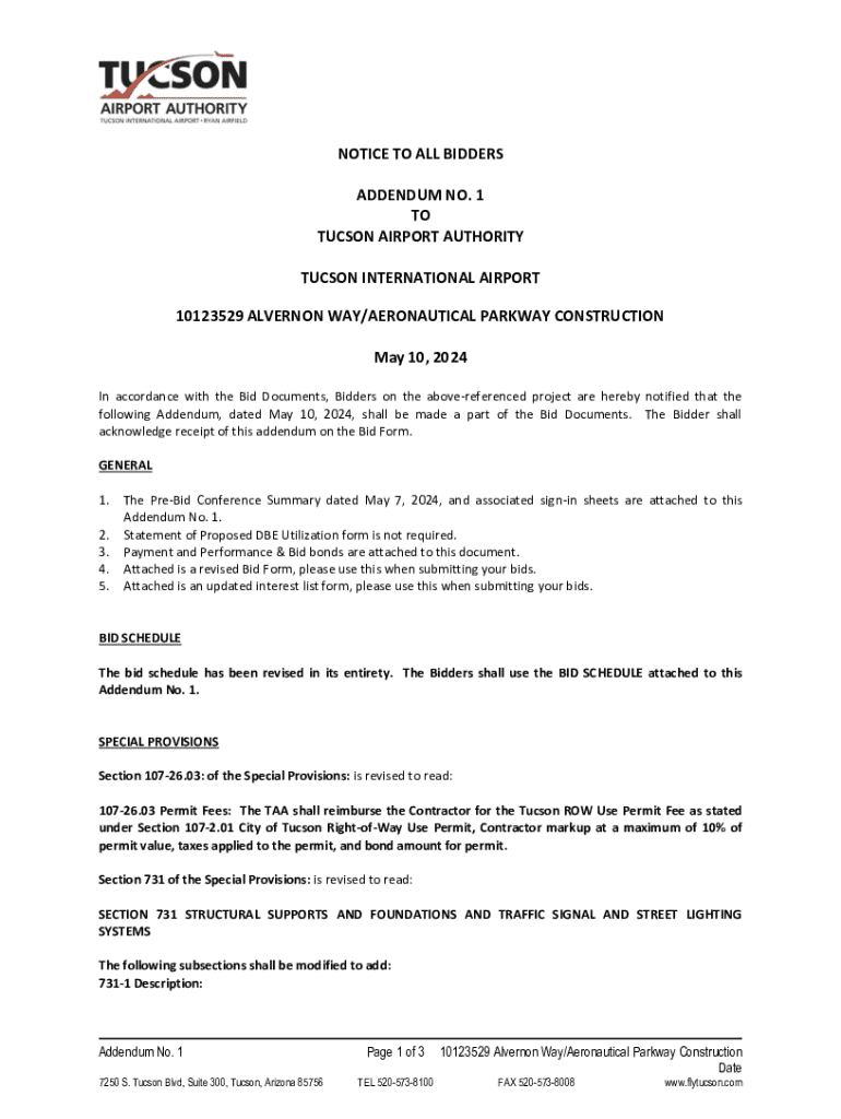 NOTICE TO ALL BIDDERS ADDENDUM NO. 1 TO TUCSON AIRPORT AUTHORITY TUCSON INTERNATIONAL AIRPORT 10123529 ALVERNON WAY/AERONAUTICAL PARKWAY CONSTRUCTION May 10, 2024 In accordance with the Bid Documents,