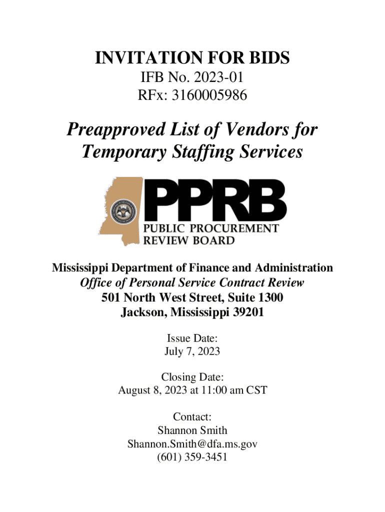 INVITATION FOR BIDS IFB No. 202301 RFx: 3160005986Preapproved List of Vendors for Temporary Staffing ServicesMississippi Department of Finance and AdministrationOffice of Personal Service Contract