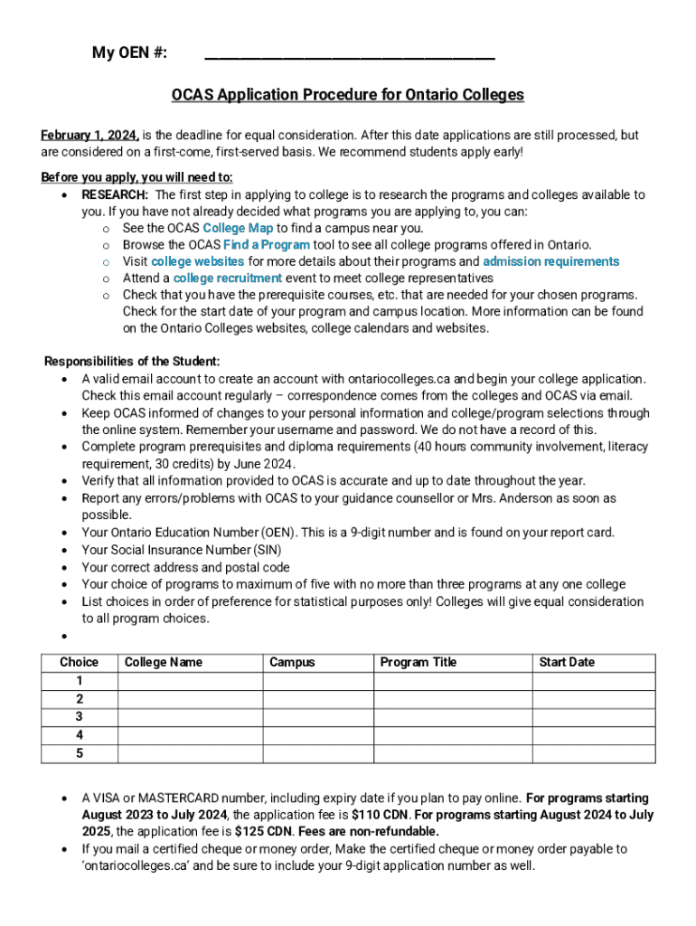 This document outlines the application procedure for Ontario colleges, including important deadlines, required documents, and steps to apply through the Ontario College Application Service (OCAS). It emphasizes the importance of early applications and provides guidance on researching programs, completing application requirements, and confirming offers of admission.