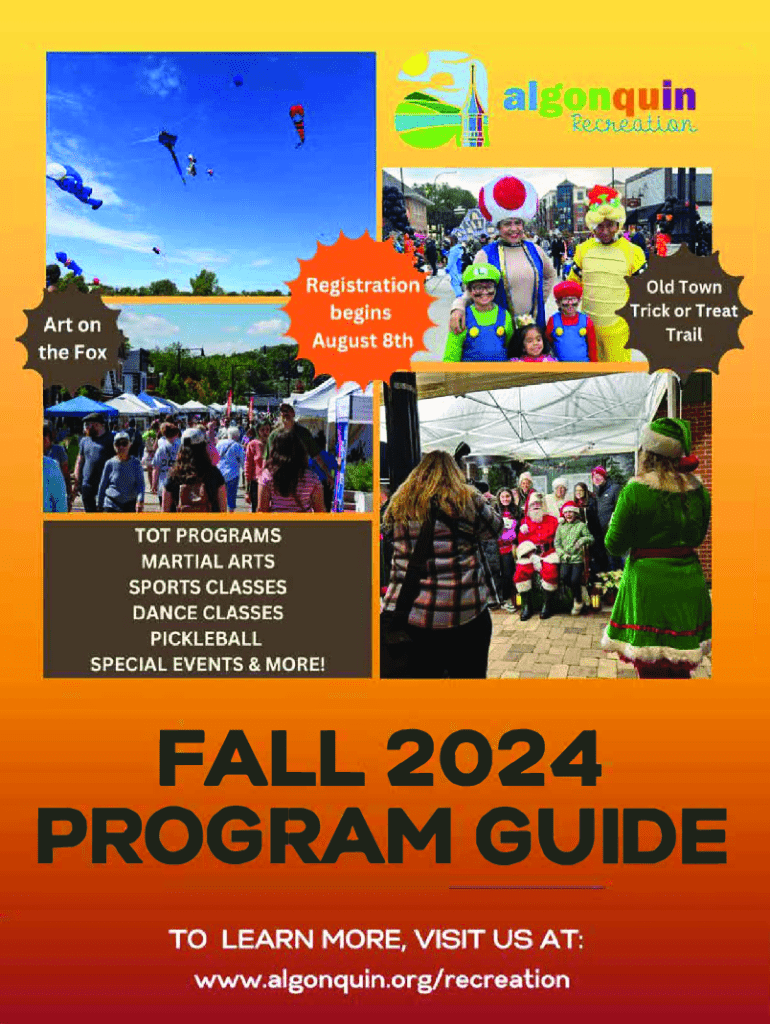 This document is a comprehensive guide to the Fall 2024 recreation programs offered by the Village of Algonquin, including various classes, events, schedules, and registration information for children and adults. It highlights swim lessons, yoga, arts, sports, and youth programs, providing essential details on instructors, locations, fees, and registration options.