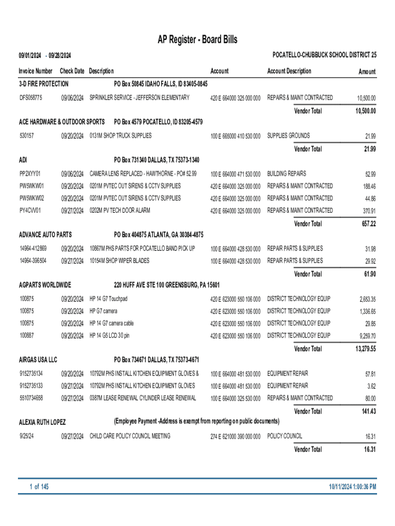 AP Register Board Bills POCATELLOCHUBBUCK SCHOOL DISTRICT 2509/01/2024 09/28/2024 Invoice NumberCheck DateDescription3D FIRE PROTECTION DFS05877509/06/202409/20/2024ADIAccount Description420 E 664000