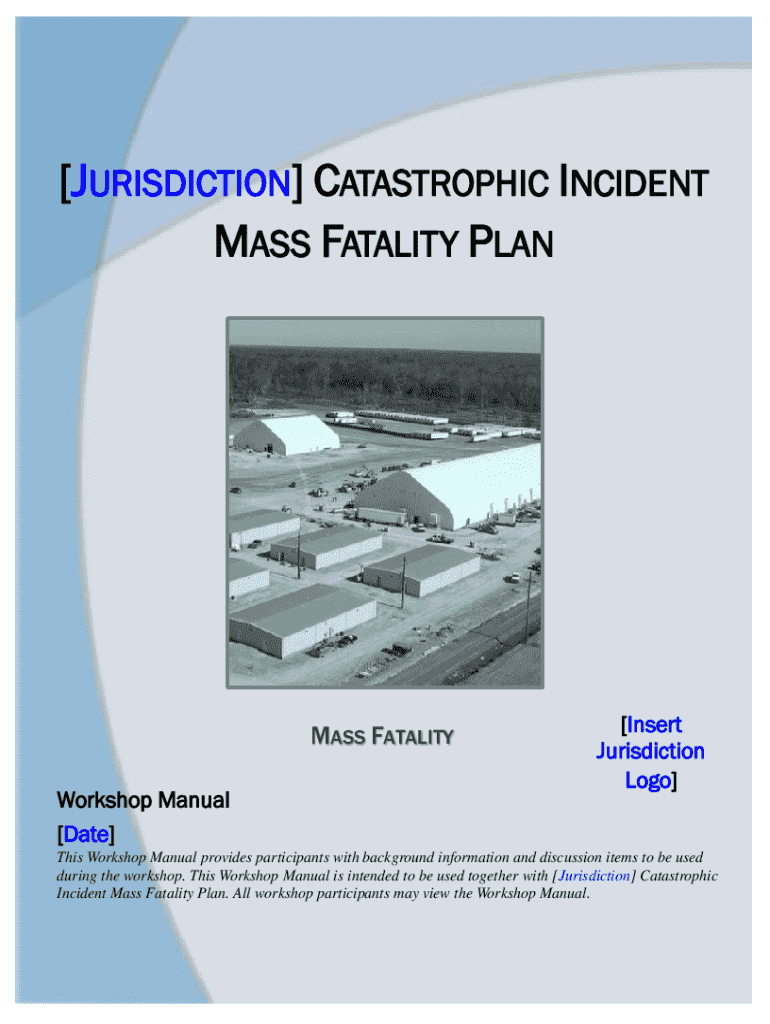 [JURISDICTION] CATASTROPHIC INCIDENT MASS FATALITY PLANMASS FATALITY Workshop Manual [Date][Insert Jurisdiction Logo]This Workshop Manual provides participants with background information and discussion