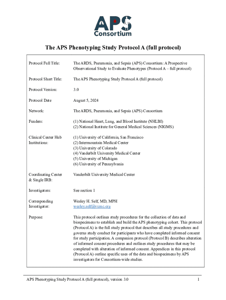 The APS Phenotyping Study Protocol A (full protocol) Protocol Full Title:The ARDS, Pneumonia, and Sepsis (APS) Consortium: A Prospective Observational Study to Evaluate Phenotypes (Protocol A full