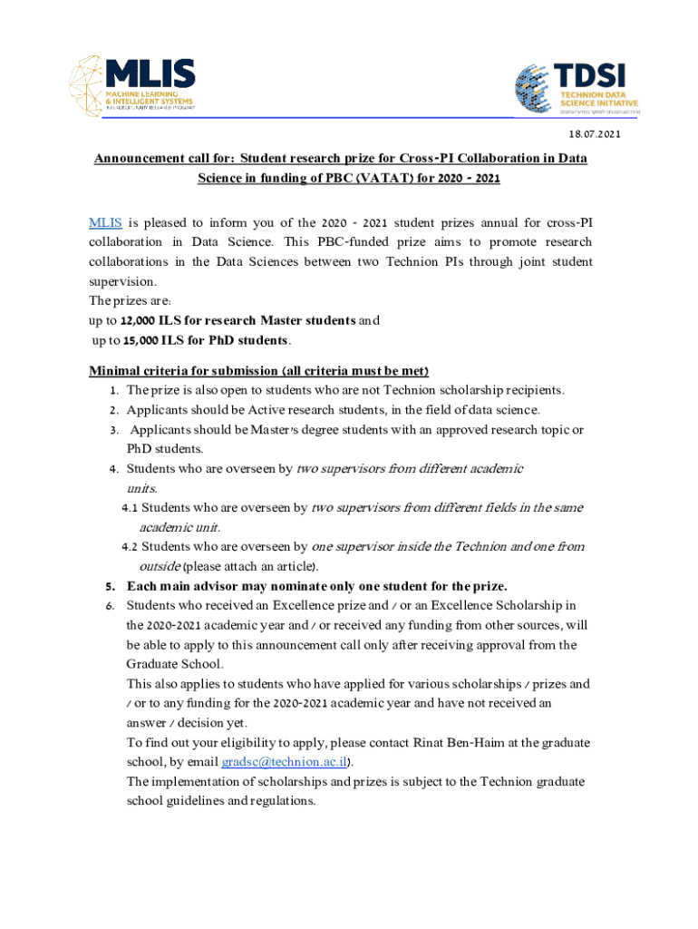 18.07.2021Announcement call for: Student research prize for CrossPI Collaboration in Data Science in funding of PBC (VATAT) for 2020 2021 MLIS is pleased to inform you of the 2020 2021 student prizes
