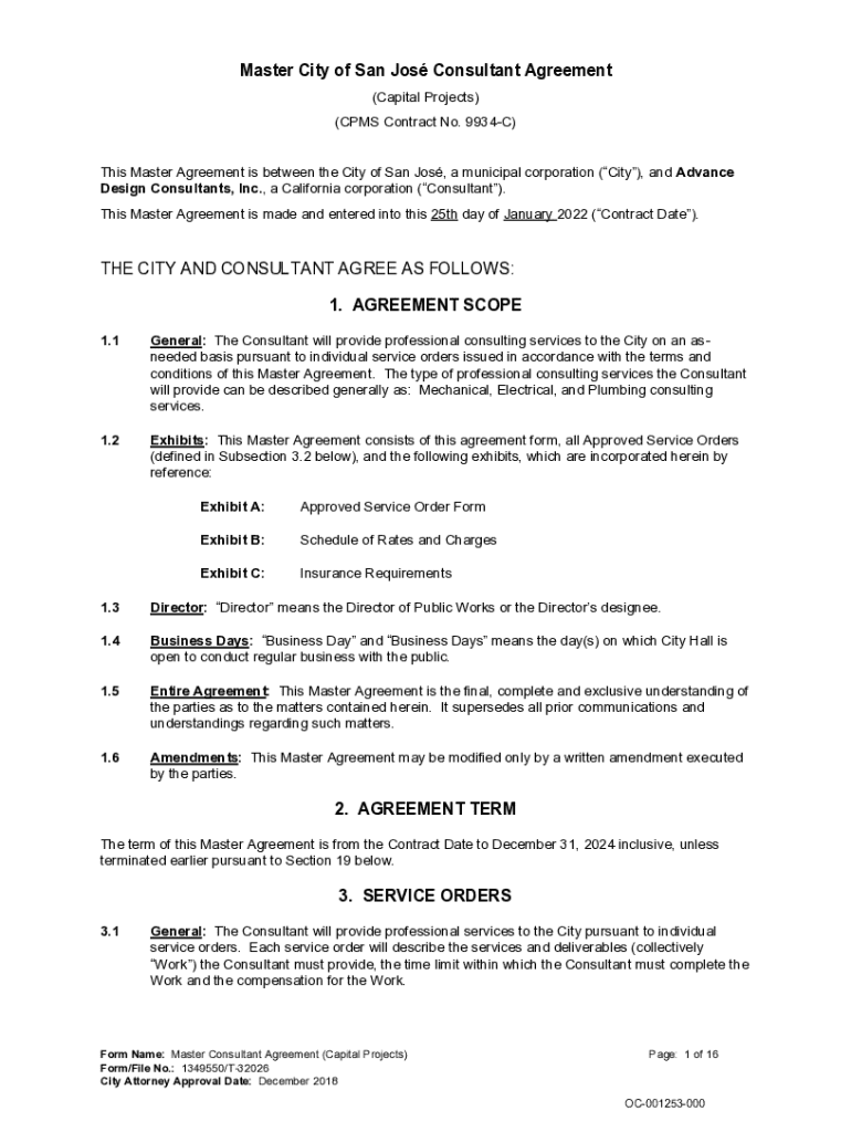 This Master Agreement establishes the terms under which Advance Design Consultants, Inc. provides professional consulting services to the City of San José, specifically focusing on Mechanical, Electrical, and Plumbing consulting services as needed through individual service orders. The agreement outlines the scope, terms, conditions, compensation, and obligations of both parties until December 31, 2024.