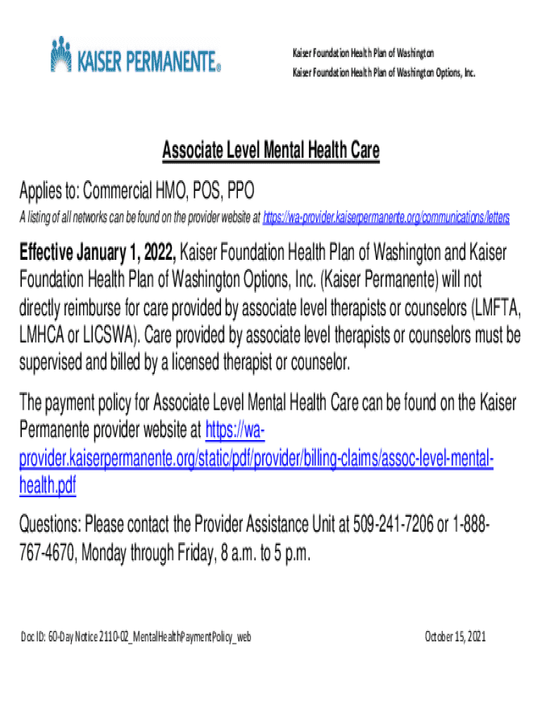Kaiser Foundation Health Plan of Washington Kaiser Foundation Health Plan of Washington Options, Inc.Associate Level Mental Health Care Applies to: Commercial HMO, POS, PPO A listing of all networks