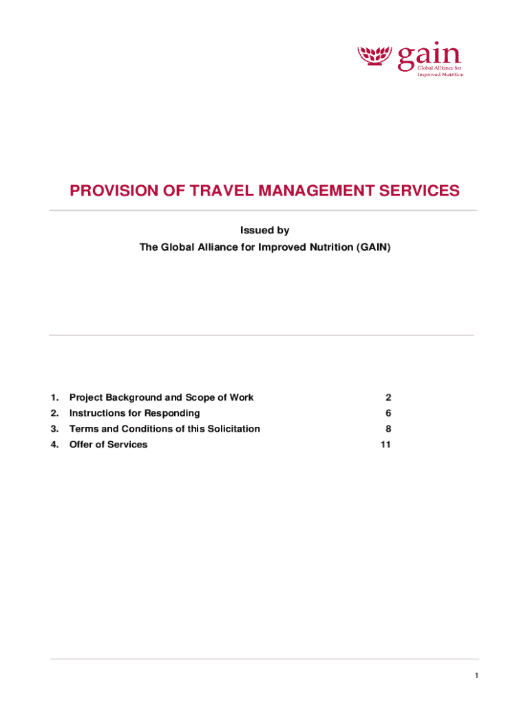 This document outlines the Request for Proposal (RFP) issued by the Global Alliance for Improved Nutrition (GAIN) for partnering with a Travel Management Company (TMC) to provide comprehensive travel management services. The scope includes international and domestic travel planning, cost efficiency, safety and security measures, as well as sustainability practices in alignment with GAIN\'s mission to improve nutrition worldwide.