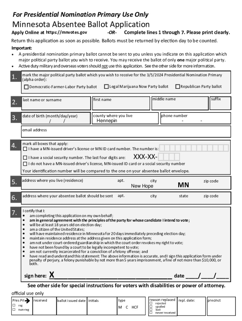 For Presidential Nomination Primary Use OnlyMinnesota Absentee Ballot ApplicationComplete lines 1 through 7. Please print clearly. Return this application as soon as possible. Ballots must be returned