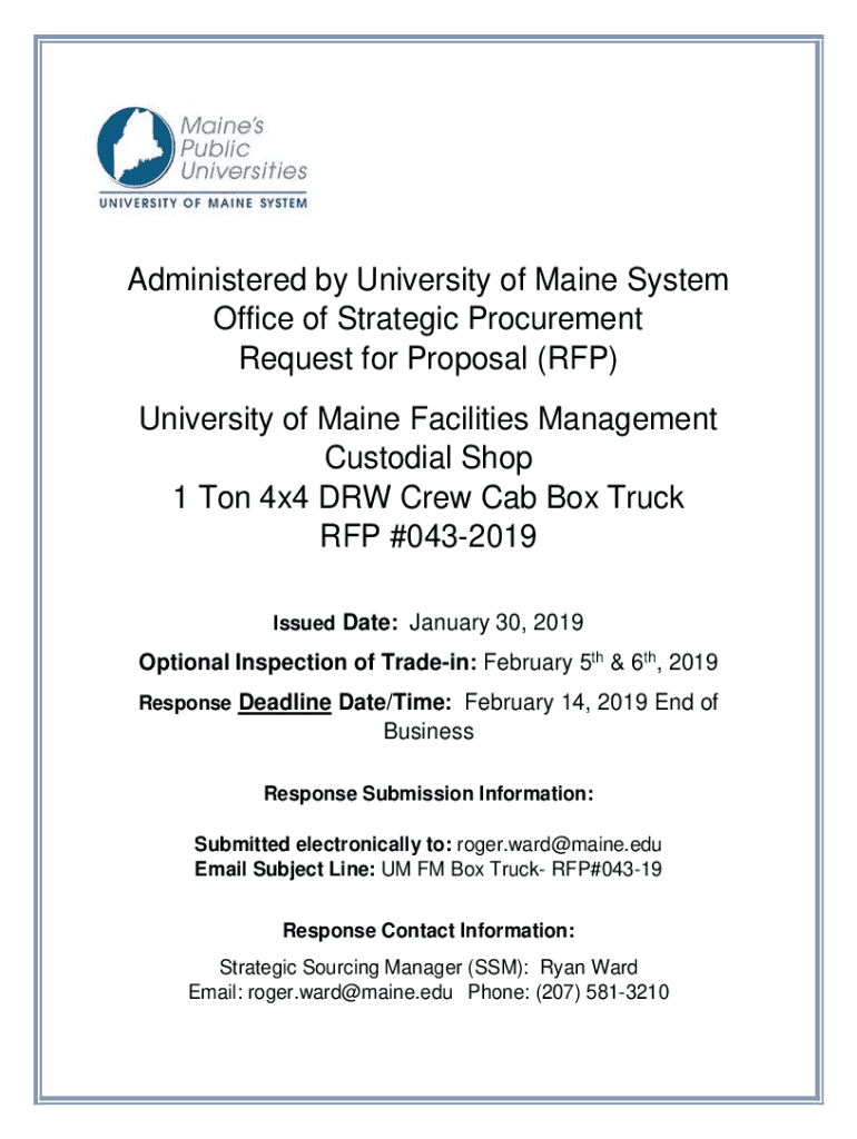 This document outlines a Request for Proposal (RFP) issued by the University of Maine System for the procurement of a 1 Ton 4x4 DRW Crew Cab Box Truck for Facilities Management. It includes specifications for the truck, submission guidelines, evaluation criteria, and terms for response.
