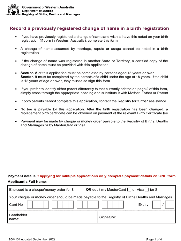 This form is used to record a previously registered change of name in a birth registration for individuals born in Western Australia or for their parents if the individual is under 18. It details the process for completing the application, including requirements for identification, submission methods, and payment information for obtaining a replacement birth certificate.