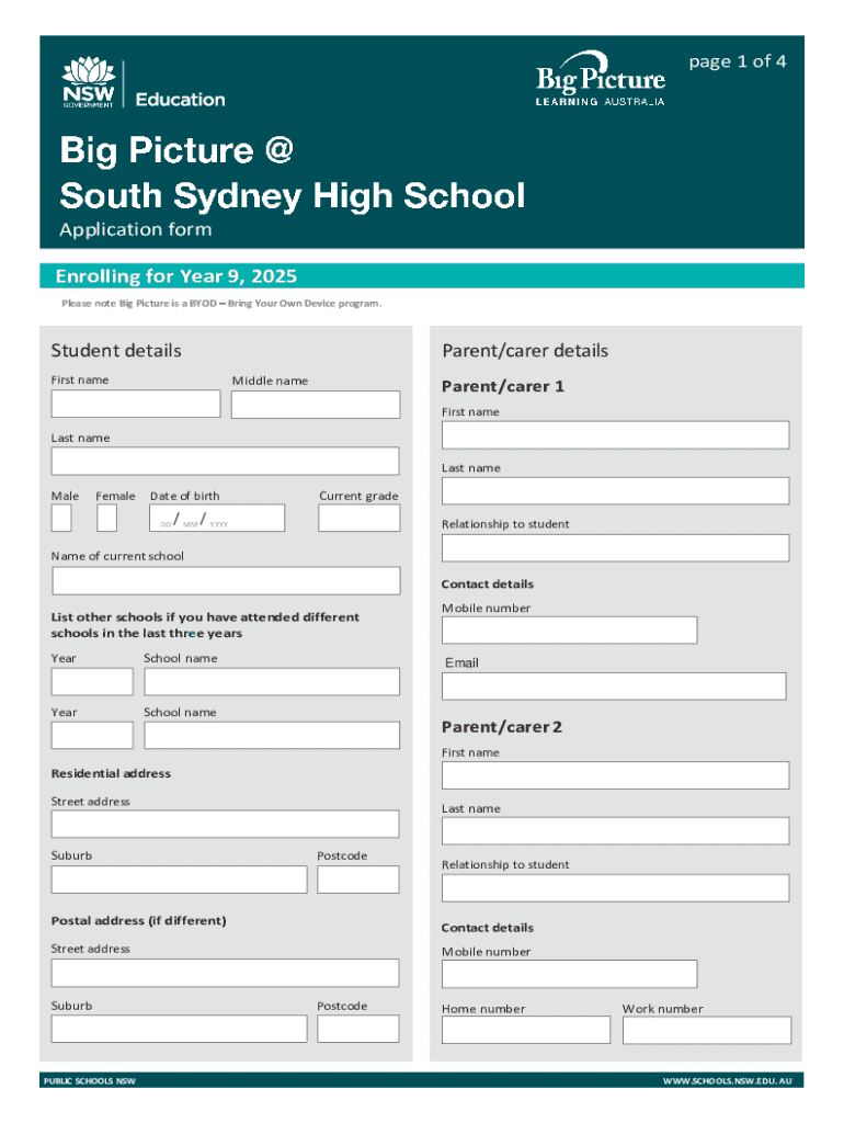 This application form is for students enrolling in Year 9 at South Sydney High School for the Big Picture Academy in 2025. It collects personal details of the student and parent/carer, as well as information about the student\'s strengths, weaknesses, and motivations for joining the program.