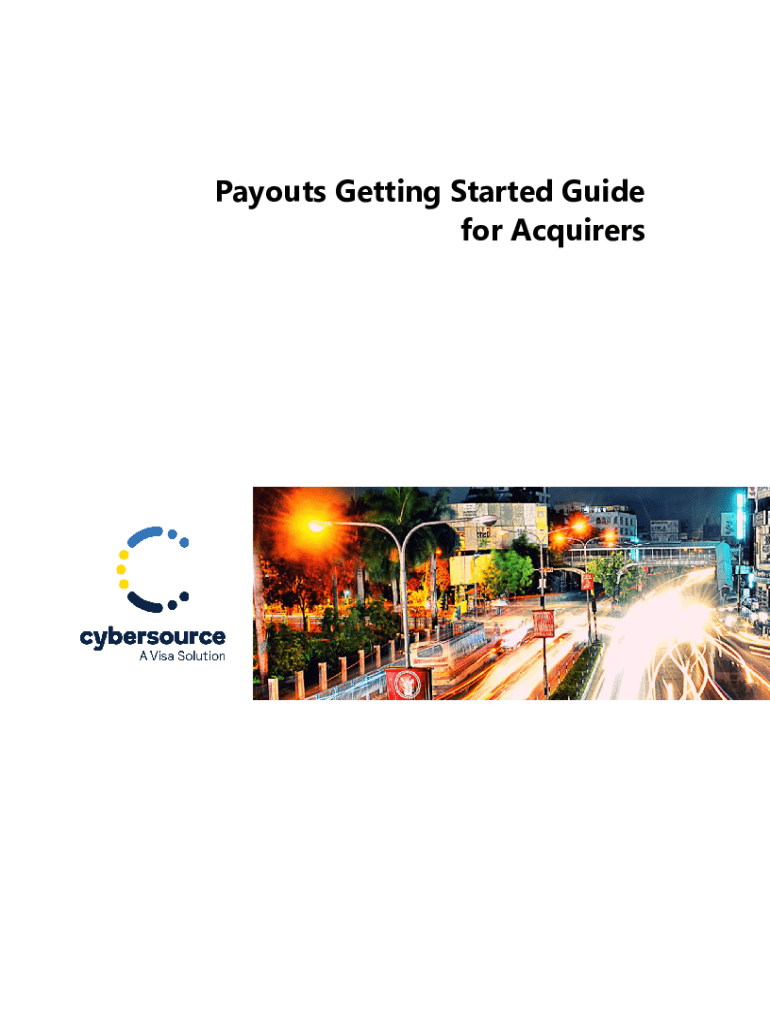 This guide provides an overview of how acquirers can implement and utilize CyberSource Payouts, which leverages Visa Direct for facilitating direct fund transfers to card accounts. It details transaction flows, merchant and acquirer setup processes, requirements, risk controls, and auxiliary services needed for effective operation.