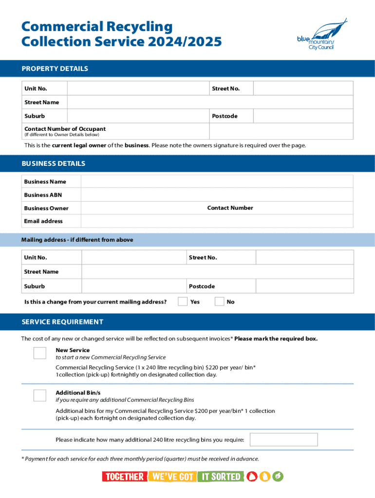 Commercial Recycling Collection Service 2024/2025 PROPERTY DETAILS Unit No.Street No.Street Name SuburbPostcodeContact Number of Occupant (If different to Owner Details below)This is the current legal