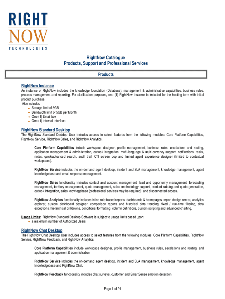 RightNow Catalogue Products, Support and Professional Services Products RightNow InstanceAn instance of RightNow includes the knowledge foundation (Database), management & administrative capabilities,