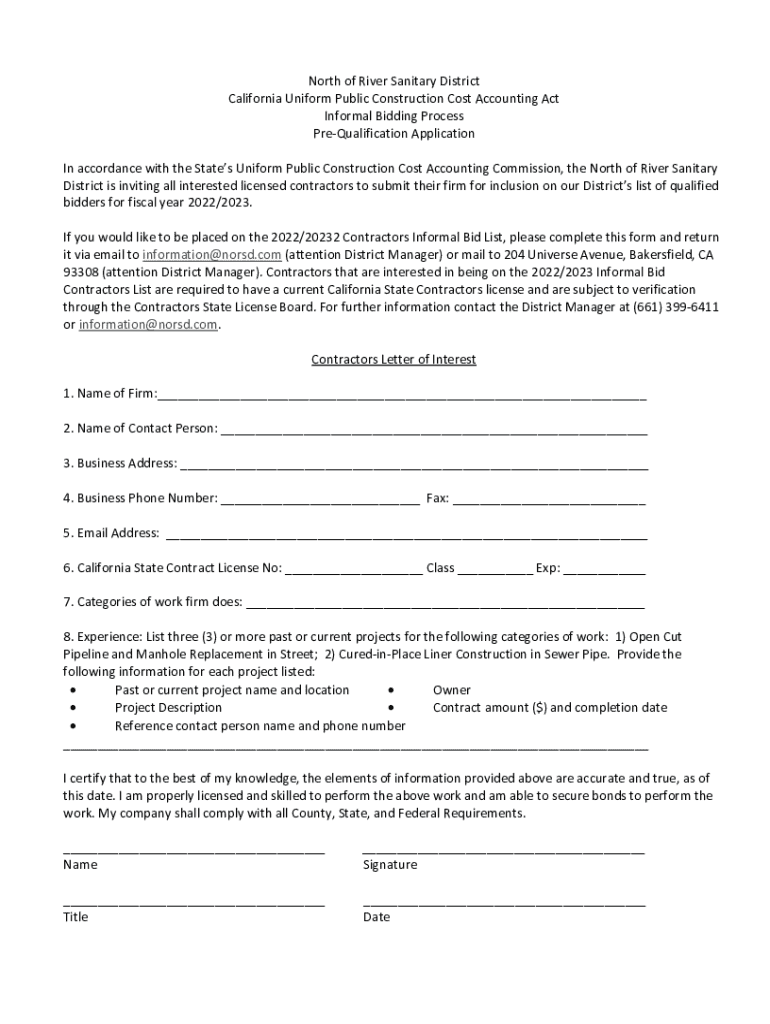 North of River Sanitary District California Uniform Public Construction Cost Accounting Act Informal Bidding Process PreQualification Application In accordance with the States Uniform Public Construction