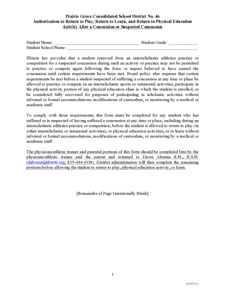 This document outlines the procedures and requirements for students who have suffered a concussion or suspected concussion to safely return to athletic activities, physical education, and academic learning. It includes sections for completion by healthcare providers, parents or guardians, and school administration to ensure compliance with Illinois law and district policy.