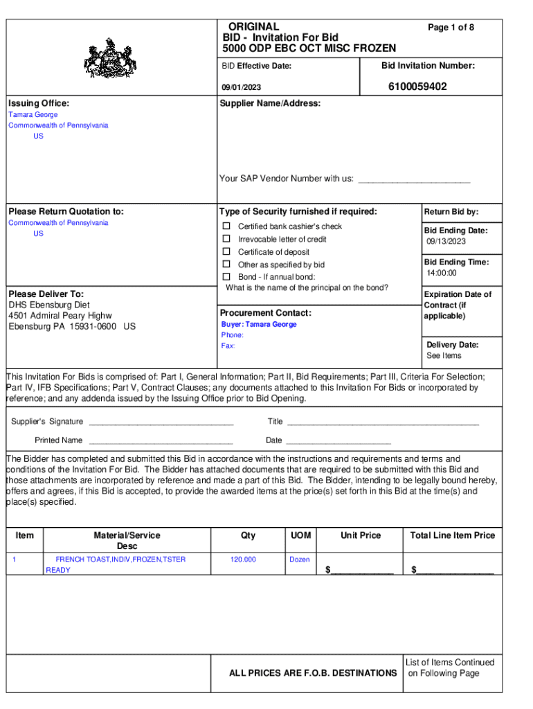 This document is the Invitation For Bid issued by the Commonwealth of Pennsylvania for the procurement of frozen breakfast items. It outlines the bid requirements, acceptable brands, quantities, and delivery dates for various frozen food products including French toast, pancakes, waffles, and liquid egg products. The document emphasizes compliance with specified conditions and includes essential bid submission instructions.