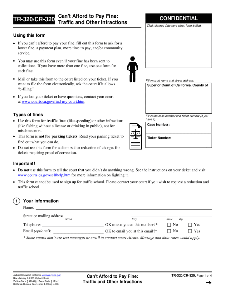 This form is intended for individuals who cannot afford to pay their traffic fines or other infractions. It allows users to request a lower fine, set up a payment plan, or seek community service as an alternative. The form is not applicable for dismissals, reductions of charges, or parking tickets.