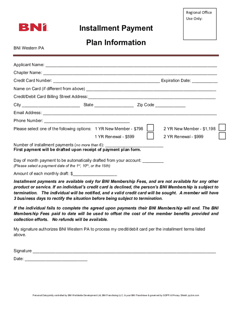 Regional Office Use Only:Installment Payment BNI Western PAPlan InformationApplicant Name: ___ Chapter Name: ___ Credit Card Number: ___ Expiration Date: ___ Name on Card (if different from above)