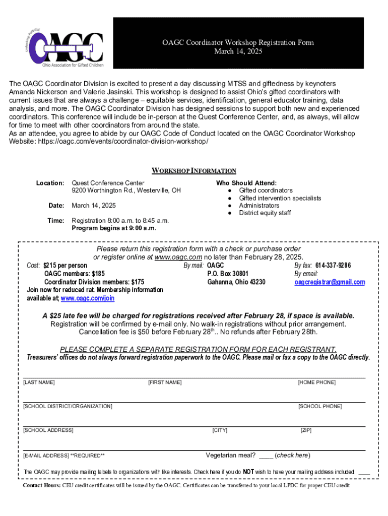 This registration form allows attendees to register for the OAGC Coordinator Workshop scheduled for March 14, 2025, at the Quest Conference Center. The workshop will cover topics related to MTSS and giftedness, providing valuable insights and support for gifted coordinators, intervention specialists, and administrators in Ohio.